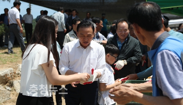 22일 오전에는 풍세면 남관 3리에서 구본영 시장과 친환경농업인, 농업관련 기관·단체, 주민, 학생 등 200여 명이 참석한 가운데 친환경 농업발전 의지를 다지는 우렁이를 방사 시연행사를 가졌다.