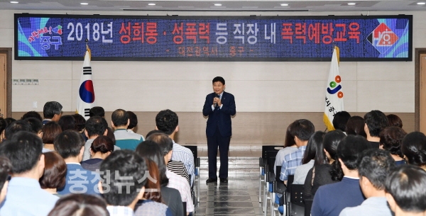 대전 중구(구청장 박용갑)는 26일 청사 대회의실에서 직원 400여명을 대상으로 4대 폭력예방교육을 실시했다.