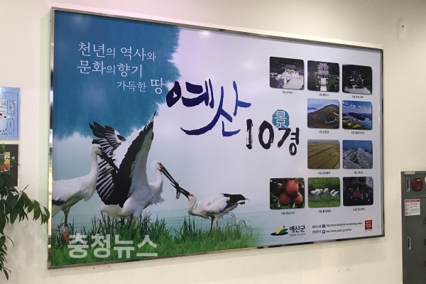 홍보 내용은 예산10경으로 1경 수덕사, 2경 충의사, 3경 추사고택, 4경 임존성, 5경 예당호, 6경 삽교평야, 7경 가야산, 8경 예산사과, 9경 예산황새공원, 10경 덕산온천 사진을 통해 홍보하고 있다.