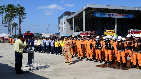 이번 훈련은 재난 및 안전관리기본법 제35조에 따라 실시하는 훈련으로써, 공장에서 발생한 대형화재를 가상으로 월미농공단지 내 라톤코리아 공주공장에서 유관기관과 민간단체 등 13개 기관‧단체 300여명이 참여한 가운데 진행됐다.