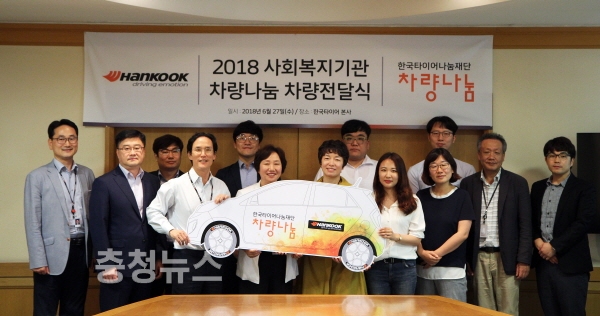 한국타이어(대표이사 조현범)의 사회공헌재단인 한국타이어나눔재단이 지난 27일 한국타이어 본사에서 ‘2018 사회복지기관 차량나눔’ 차량 전달식을 진행했다.