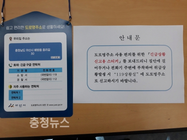 이홍군 아산시 토지관리과장은 “긴급상황 발생 시 정확하지 않은 위치 전달 신고는 화재를 초동 진압하거나 환자를 구할 수 있는 골든타임을 확보할 수 없으나 도로명주소로 신고하면 신속한 출동이 가능하여 생명과 재산을 지킬 수 있다”며, “스티커를 잘 보이는 곳에 부착해 활용해 달라”고 말했다.