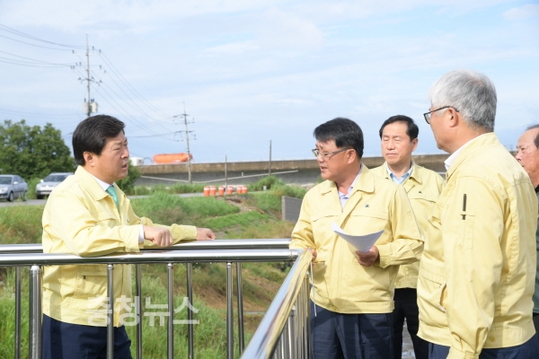 황명선 논산시장이 2일 오전 재해위험지구인 은진면 방축천과 중교천 등을 찾아 비 피해 현장을 점검하고 대책마련에 만전을 기해줄 것을 주문했다.