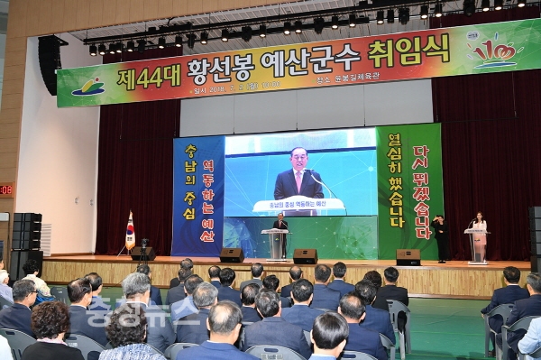 충남 예산군은 2일 윤봉길체육관에서 제44대 황선봉 예산군수 취임식을 가졌다. 이날 취임식은 홍문표 국회의원을 비롯해 기관단체장, 도의원, 군의원, 주민 등 1500여 명이 참석한 가운데 진행됐다.
