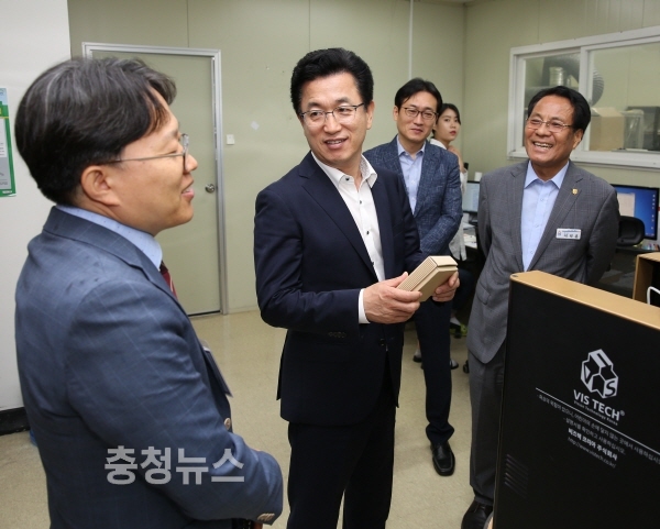 허태정 대전시장과 이덕훈 한남대 총장 등이 한남대 대덕밸리캠퍼스의 입주 벤처기업을 둘러보고 있다.