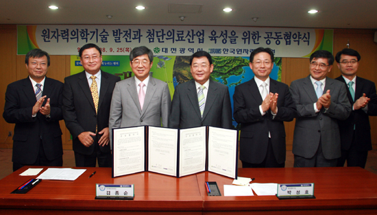 대전시가 25일 오후 시청 중회의실에서 박성효 대전시장과 김종순 원자력의학원장, 최창운 원자력병원장 등이 참석한 가운데 '원자력의학기술 발전과 첨단의료산업 육성에 관한 공동 협약'(MOU)을 체결했다.