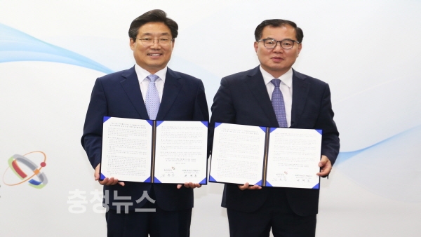 도시재생뉴딜사업지역 공공임대주택공급추진 업무협약(사진 왼쪽 김홍장 시장 오른쪽 충남개발공사 권혁문 사장)