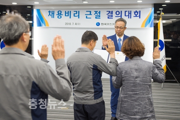 한국가스기술공사(사장 고영태)는 4일 대전 본사 강당에서 채용비리 근절 실천 분위기 확산 및 실천의지 향상을 위해 ‘채용비리 근절 결의대회’를 개최했다.
