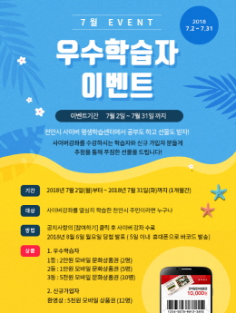 충남 천안시 사이버 평생학습센터는 이달 31일까지 사이버강좌를 열심히 학습한 우수학습자와 신규 가입자를 대상으로 수강 이벤트를 진행한다.