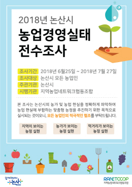 이달 27일까지 실시하는 농업경영실태 전수조사는 2018년 5월 기준 논산시에 주소를 두고 농업경영체 등록이 된 농업인(1만5586농가)을 대상으로 방문을 통한 면접조사로 진행한다.