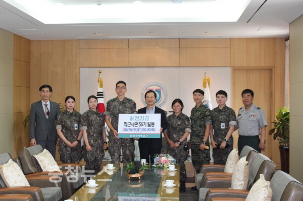 선문대학교(총장 황선조) 학군단(ROTC)은 후배들을 위해 장학금 1050만 원을 기탁했다고 6일 밝혔다. 장학금은 ROTC 56기 700만 원, ROTC 54기 350만 원으로 후배들을 위해 십시일반 모아 기탁했다.