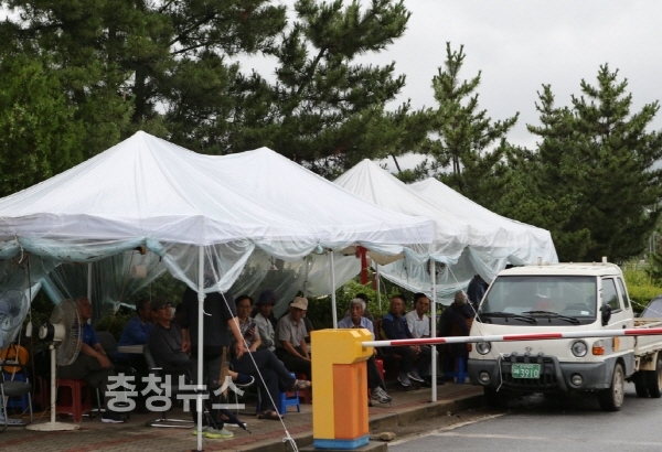 대진침대 본사에는 매트리스 2만여장이 쌓여 있으며, 본사 정문 앞에는 판정리 주민들이 천막을 치고 돌아가며 집회를 이어가고 있다.