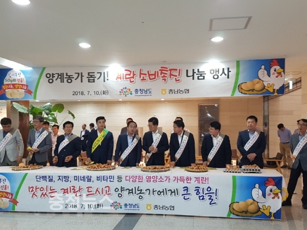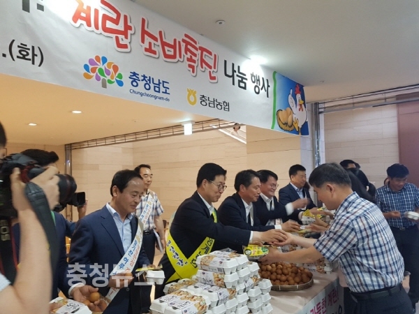농협 충남지역본부(본부장 조소행)는 최근 과잉생산과 소비부진으로 계란의 소비자 가격이 생산비의 절반수준으로 떨어진 가운데, 계란 소비확대 및 양계 농가를 돕기 위한 계란 소비촉진 나눔행사를 10일 충남도청에서 개최했다.