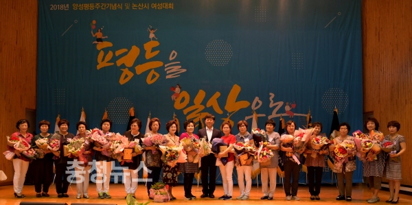충남 논산시(시장 황명선)는 양성평등주간을 기념해 지난 11일 국민체육센터에서 ‘2018 양성평등주간 기념식 및 여성대회’를 개최하고 화합을 다졌다.