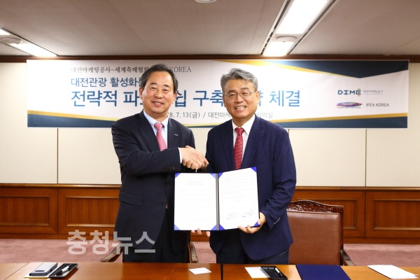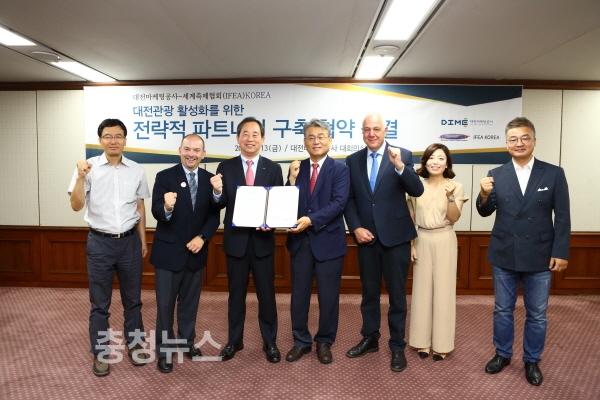 대전마케팅공사와 세계축제협회 한국지부(IFEA KOREA)는 13일 공사 대회의실에서 세계축제협회 커티스 의장과 네델란드 축제공사 몰맨 사장이 배석한 가운데 대전관광 활성화를 위한 전략적 파트너쉽 구축 협약을 체결했다고 밝혔다.