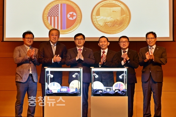 한국조폐공사는 16일 서울 충정로 풍산빌딩에서 조용만 사장과 입 팍 링(Yip Pak Ling) 싱가포르 조폐국장, 류진 풍산 그룹 회장, 한기열 NH농협은행 부행장, 황선욱 현대홈쇼핑 상무 등이 참석한 가운데 ‘한반도 평화 기념메달’(평화, 새로운 시작)을 공개했다.
