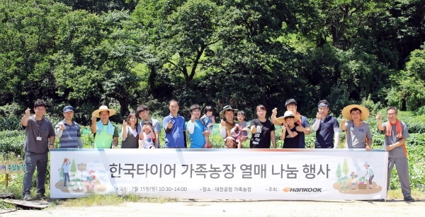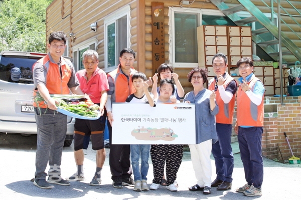 한국타이어(대표이사 조현범)는 지난 15일 대전 대덕구 와동에 위치한 사회복지시설 예솜동산에서 사원 및 사원 가족들과 시설 관계자등 10여명이 참석한 가운데 직접 수확한 농작물 전달 행사를 진행했다.