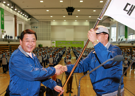 대전시가 7일 전남 여수 일원에서 열리는 제89회 전국체육대회의 선수단과 임원, 박성효 대전시장을 비롯한 700여명이 참석한 가운데 대전대학교 맥센터 체육관에서 출정식을 개최했다.