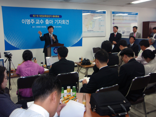 이명주 공주교대 교수(현 충남대 연구교수)는 2008년 10월 8일(수) 오후 2시 둔산동의 이명주예비후보사무실에서 기자회견을 갖고 오는 12월 17일에 실시하는 제7대 대전광역시 교육감 선거에 출마를 공식선언했다.