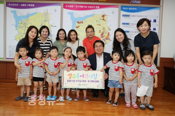 오세현 아산시장은 “고사리 같은 작은 손으로 어려운 이웃을 위해 나눔 활동을 해준 엘크루어린이집 40명의 천사와 학부모님들께 감사드린다. 아산의 미래인 우리 아이들이 건강하고 인성이 바른 아이들로 자라나길 응원하며 기탁한 성금은 소중한 곳에 전달하도록 하겠다”고 말했다.
