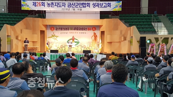 농촌지도자 금산군연합회(회장 김현배)에서는 지난 18일 금산군종합체육관에서 관내 유관기관 단체장 및 농촌지도자 600여회원이 참석한 가운데 ‘농촌지도자 금산군연합회 성과보고 및 가족화합행사’를 개최했다.