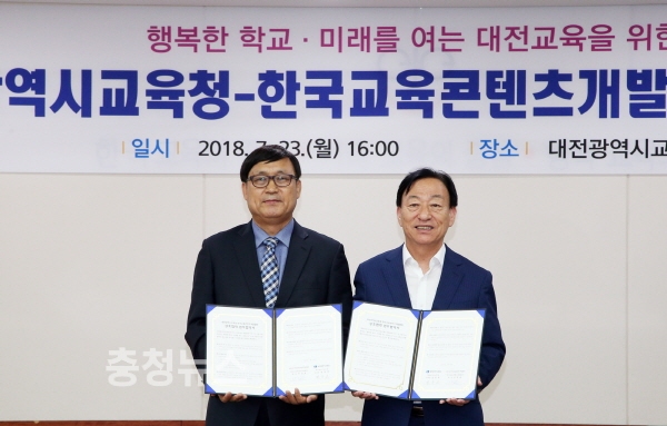 대전시교육청(교육감 설동호)은 23일 시교육청 중회의실에서 한국교육콘턴츠개발협회(회장 서상윤)와 ‘행복한 학교, 미래를 여는 대전교육’ 비전 실현을 위한 인성․생활안전․비주얼씽킹 교육 관련 업무협약을 체결했다.