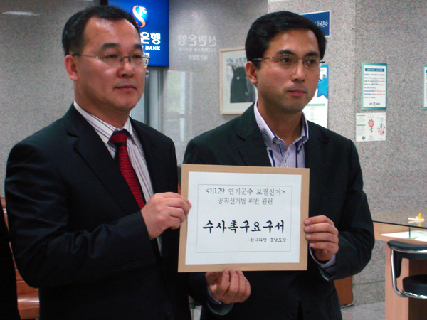 한나라당 충남도당 박희조사무처장과 김수진 대변인은 13일오후 대전지방검찰청을 방문 직접수사를 촉구요구서를 접수하고 이번 연기군수보궐선거가 각 정당과 후보자는 물론 지역의 유권자들로 하여금 온갖 억측과 소문만 양산하는 현 상황을 안타깝게 생각하여, 이번 수사를 지휘하는 대전지검에 엄정하고 조속한 수사를 촉구하는 수사촉구요구서를 오늘 대전지검 민원실에 접수 했다고 밝혔다..