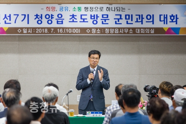 김돈곤 청양군수가 민선7기 취임과 함께 실시한 읍·면 초도방문에서 군민이 중심이 되는 청양 발전의 비전을 제시했다.