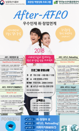 농식품부와 aT는 아프로 단원들이 활동 후에도 지속적으로 역량을 개발․관리할 수 있도록 수료 단원들을 중심으로 23일부터 3주간 취업ㆍ창업 역량강화 프로그램인 “After-AFLO”를 진행한다.