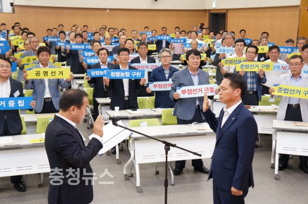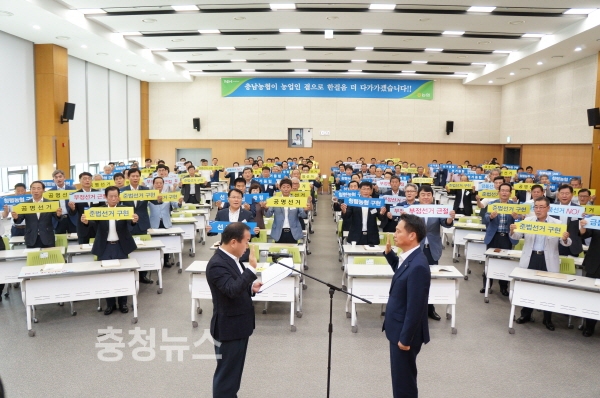 충남 곤내 조합장 결의대회를 통해 2019년 상반기에 실시되는 전국동시조합장선거의 공정한 선거문화 정착을 위해 공명선거 실천 결의문을 채택하고 최기환 조합장(당진 신평농협)이 대표해 선서했다.