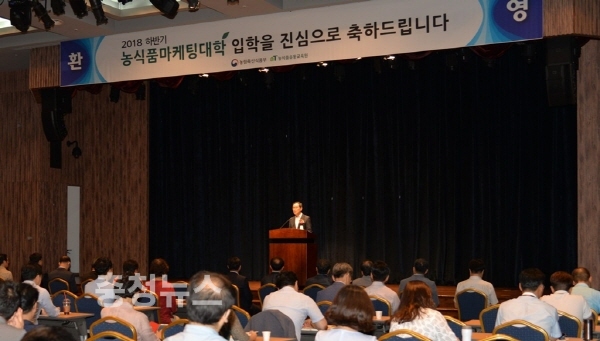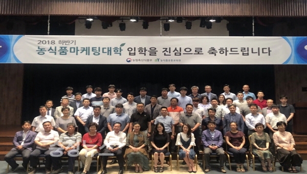 농림축산식품부와 한국농수산식품유통공사(aT, 사장 이병호)는 양재동 aT센터에서 ‘2018년 하반기 농식품마케팅대학 입학식’을 25일 가졌다.