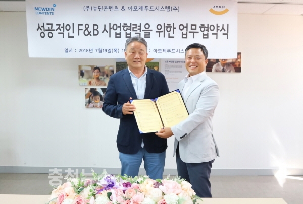이에, 뉴딘콘텐츠는 F&B 사업 역량 강화를 위해 이 분야에서 국내 최고수준의 서비스 능력을 보유한F&B 전문 기업인 아모제푸드시스템과 업무 협약을 맺고, 식자재 구매 및 관리, 메뉴 개발 등을 비롯해 지속적으로 협력을 강화해 나갈 계획이다.
