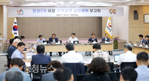 충남 서산시는 지난 25일 시청 대회의실에서 맹정호 시장을 포함한 공약사업 담당부서장 등 100여 명이 참석한 가운데 민선7기 시장 선거공약 실천계획 보고회를 개최했다.