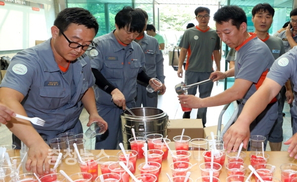 대전공장과 금산공장은 이미 지난 13일부터 수박과 얼음 등으로 수박화채를 만들어 사원들에게 제공하는 등 잠시나마 더위를 잊을 수 있도록 ‘수박화재 나눔 이벤트를 진행하고 있다.