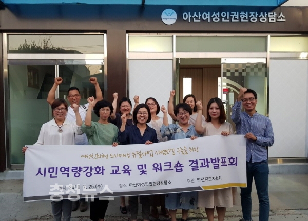 이번 교육은 여성가족부 2018년 양성평등 및 여성 사회참여확대 공모사업으로 안전지도자협회와 아산시가 추진해 여성단체·사회적경제·청년·문화예술 등 지역 활동가와 주민 등 27명을 대상으로 아산여성인권현장 상담소에서 실시됐다.