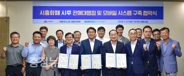 조폐공사 함수학 기술·해외이사와 임병택 시흥시장은 27일 시흥시청 다슬방에서 ‘시흥화폐 시루 발행 및 모바일시스템 구축 협약식’을 가졌다.