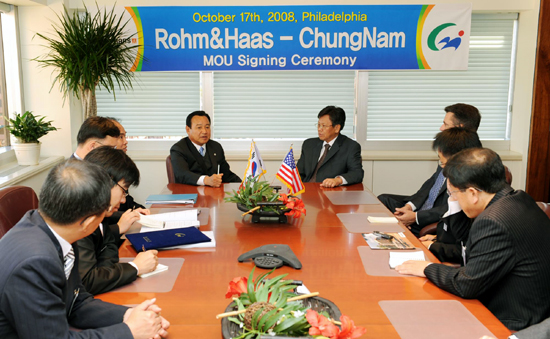 이완구 충남지사는 18일 필라델피아에서 백이현 롬앤하스 사장과 OLED 생산 및 연구개발시설 확충을 위한 투자협약서(MOU)에 서명했다.이에 따라 롬앤하스는 올해부터 2011년까지 천안시 백석동 외국인투자지역 내 9천68㎡에 4천만달러를 투입해 OLED 생산라인을 건립하고 OLED 분야의 연구개발시설을 세우게 된다.