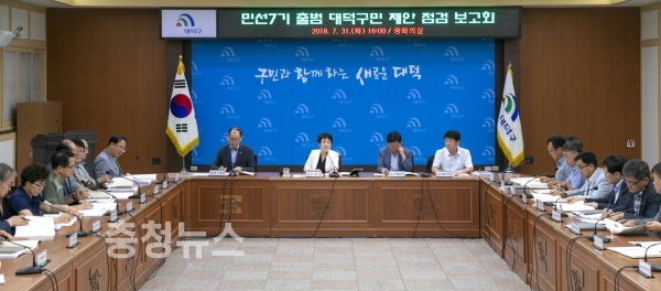 대전 대덕구(구청장 박정현)가 31일 구청장 주재로 민선7기 구청장직 인수위원회에서 수렴한 대덕구민 제안에 대한 점검 보고회를 열었다.
