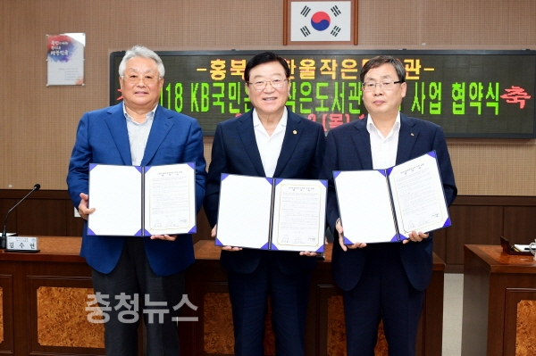 충남 홍성군은 지난 2일 군청 회의실에서 사)작은도서관만드는사람들, KB국민은행과 함께 2018 작은도서관 조성사업 협약식을 가지며 홍북읍 LH스타힐스 아동통합지원센터 내에 ‘한울 작은도서관’을 건립하겠다고 밝혔다.