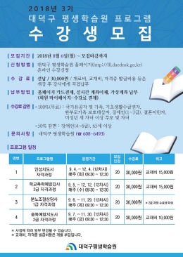 대전 대덕구 평생학습원(원장 문정순)이 6일부터 2018년 3기(9월~12월) 평생학습센터 프로그램 수강생을 선착순 모집한다.