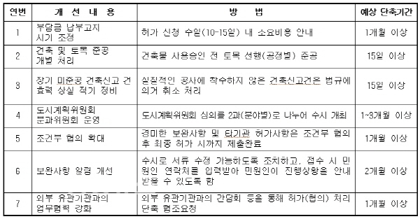 아울러 시는 현재 분야별로 1개 부서에서 총괄해 개최해 오고 있는 도시계획위원회 심의를 분야별로 2개 부서에서 수시로 개최토록 변경할 예정이며, 인허가 검토 시 단순‧경미한 보완사항과 도면수정 등을 공문으로 지시해오던 관행도 보완해 통보 없이 협의처리하고 인허가 업무 대행자 또는 민원인에게 최종허가 전까지 보완사항을 제출하는 방법으로 개선했다.