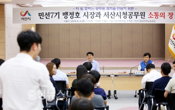 맹정호 서산시장과 서산시청공무원노동조합(위원장 김선복)은 지난 3일 서산시청 대회의실에서 7급 이하 직원들과 더 일 잘하는 공무원 조직을 만들기 위한 소통의 장을 마련했다.