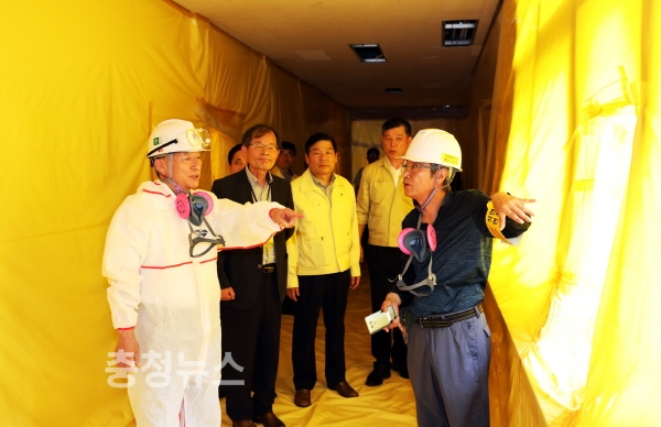 학교 석면교체공사 현장에 방문한 설동호 교육감(맨 왼쪽)