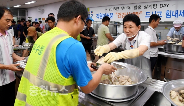 환경관리, 하수도․가로등 보수, 불법광고물 정비, 녹지관리, 주차단속 등 연일 이어지는 폭염에도 묵묵히 현장의 최일선에서 근무하는 직원을 초청해 박 청장이 직접 삼계탕을 배식했다. 또한 함께 식사를 나누며 현장의 소리와 직원들의 건의사항에 귀 기울였다.