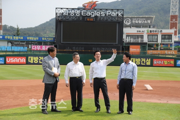 이날 관계자들은 ‘베이스볼 드림파크’조성 예정지인 한화생명 이글스파크와 한밭종합운동장을 둘러보고, 새 야구장 조성 계획과 향후 운영 방향에 대해 논의했다.