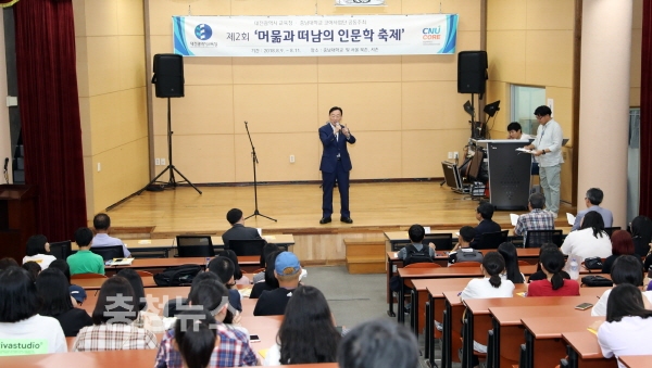 설동호 교육감이 제2회 머묾과 떠남의 인문학축제에서 인사말을 하고 있다.