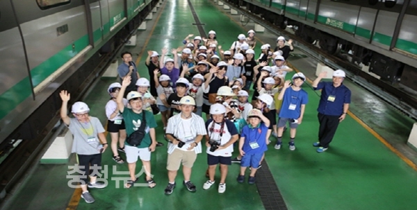 9일 도시철도공사에서 진행한‘여름방학 특별 견학프로그램’에 참석한 학생과 학부모들이 판암차량기지 검사고와 전동차를 견학하고 있다.