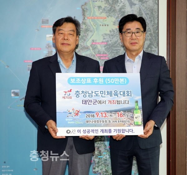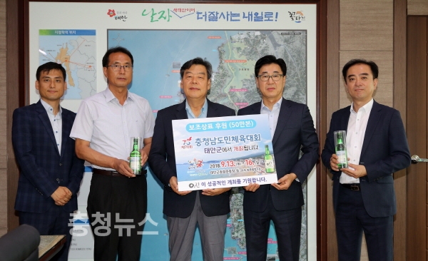 충남 태안군은 지난 9일 군청 군수실에서 가세로 군수와 ㈜맥키스 컴퍼니 송규한 대외협력실장 등 6명이 참석한 가운데 O₂린 도민체전 홍보 라벨 전달식을 가졌다고 밝혔다.