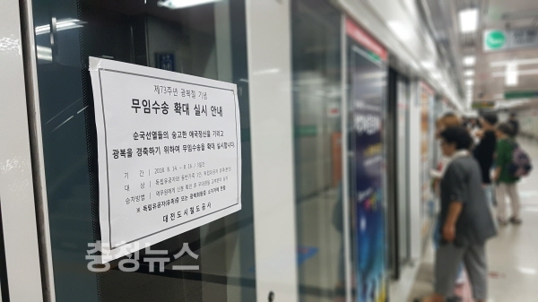 한편, 대전도시철도도 해당 기간 중 무료로 이용할 수 있으며, 독립유공자증(유족증)을 역무원에 제시하고 우대권을 받으면 된다. 독립유공자는 동반가족 1명까지 무료다.