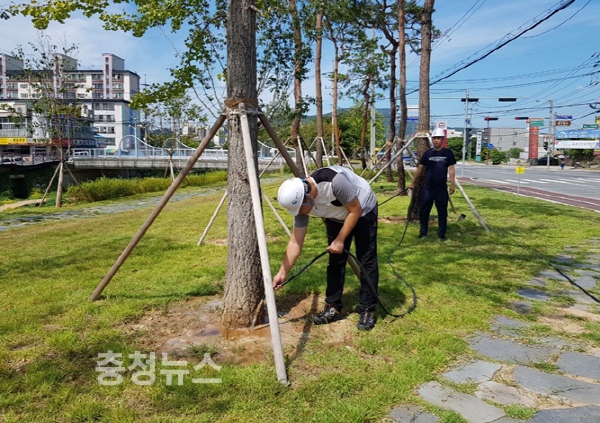 충남 홍성군은 지속되는 폭염 및 가뭄에 대비해 관내 주요도로변 가로수와 공원 등 수목에 대하여 생육환경에 지장이 없도록 물주기에 행정력을 집중하고 있다.